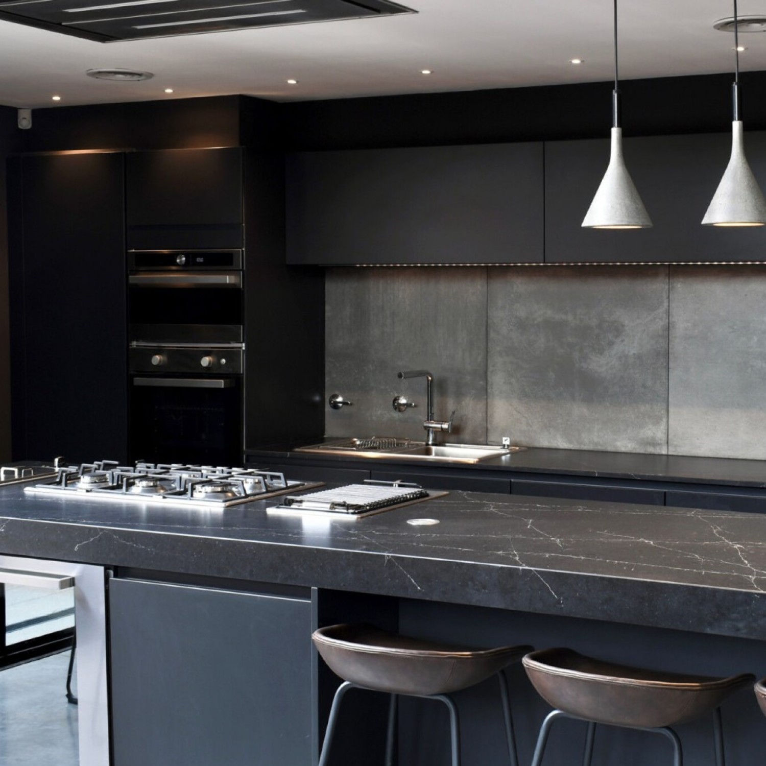 Negro Marquina viene en el formato jumbo de 320 x 160 cm. Los grandes formatos permiten resolver diseños customizados o superficies extensas en una única pieza. Con menos cantidad de juntas, le dan continuidad visual, higiene y majestuosidad a tu mesada.