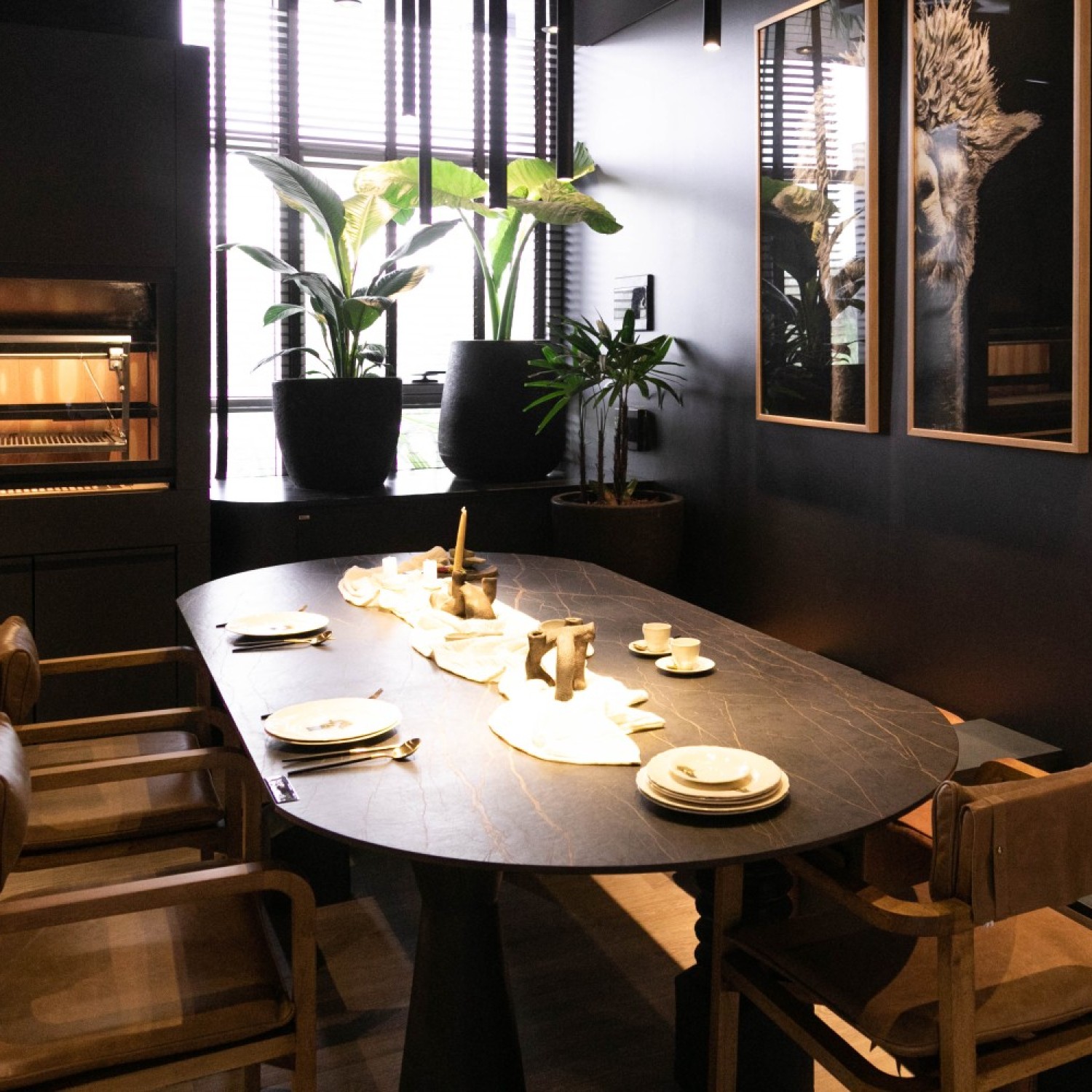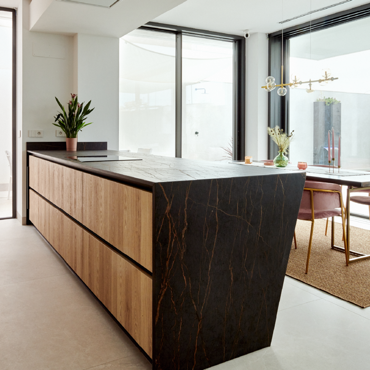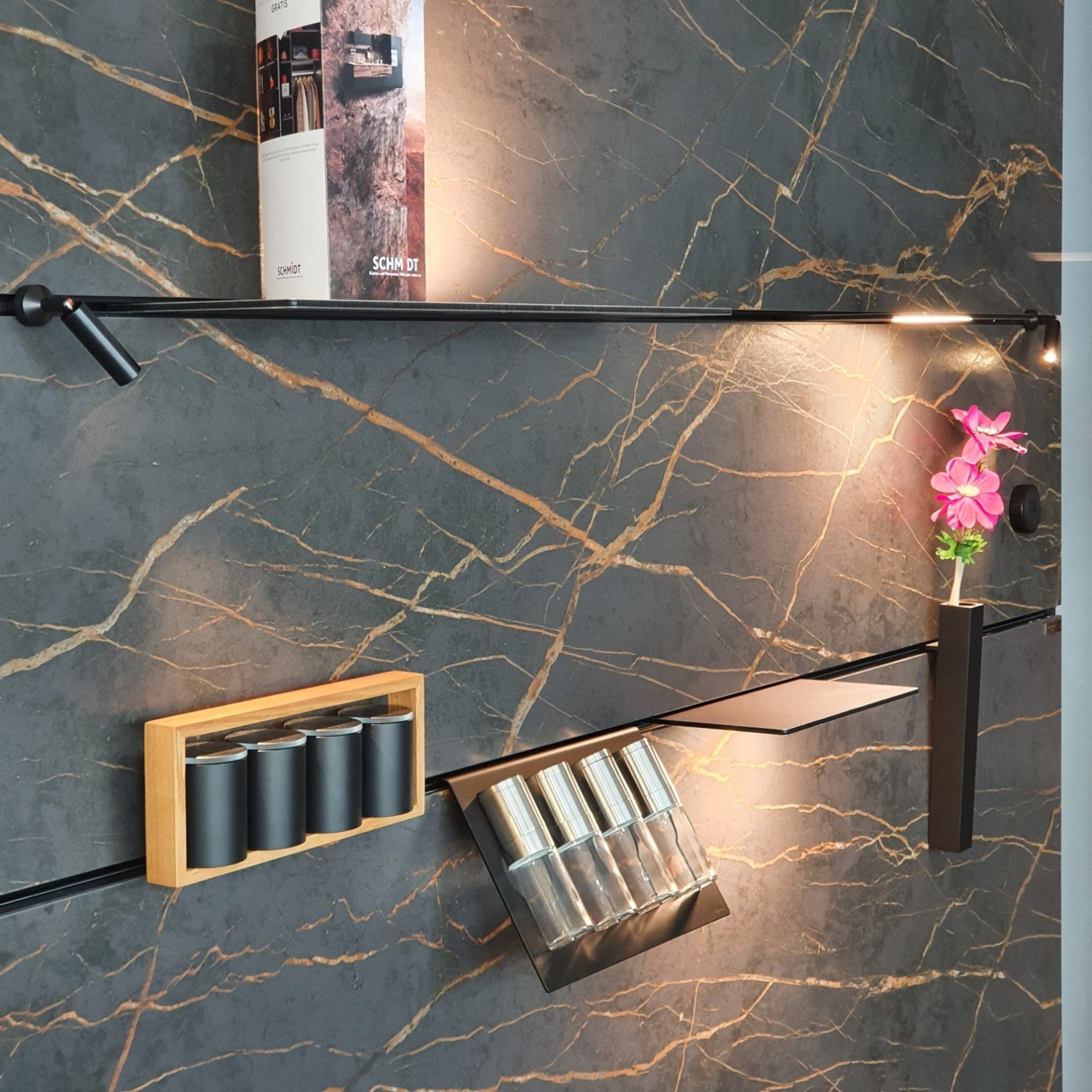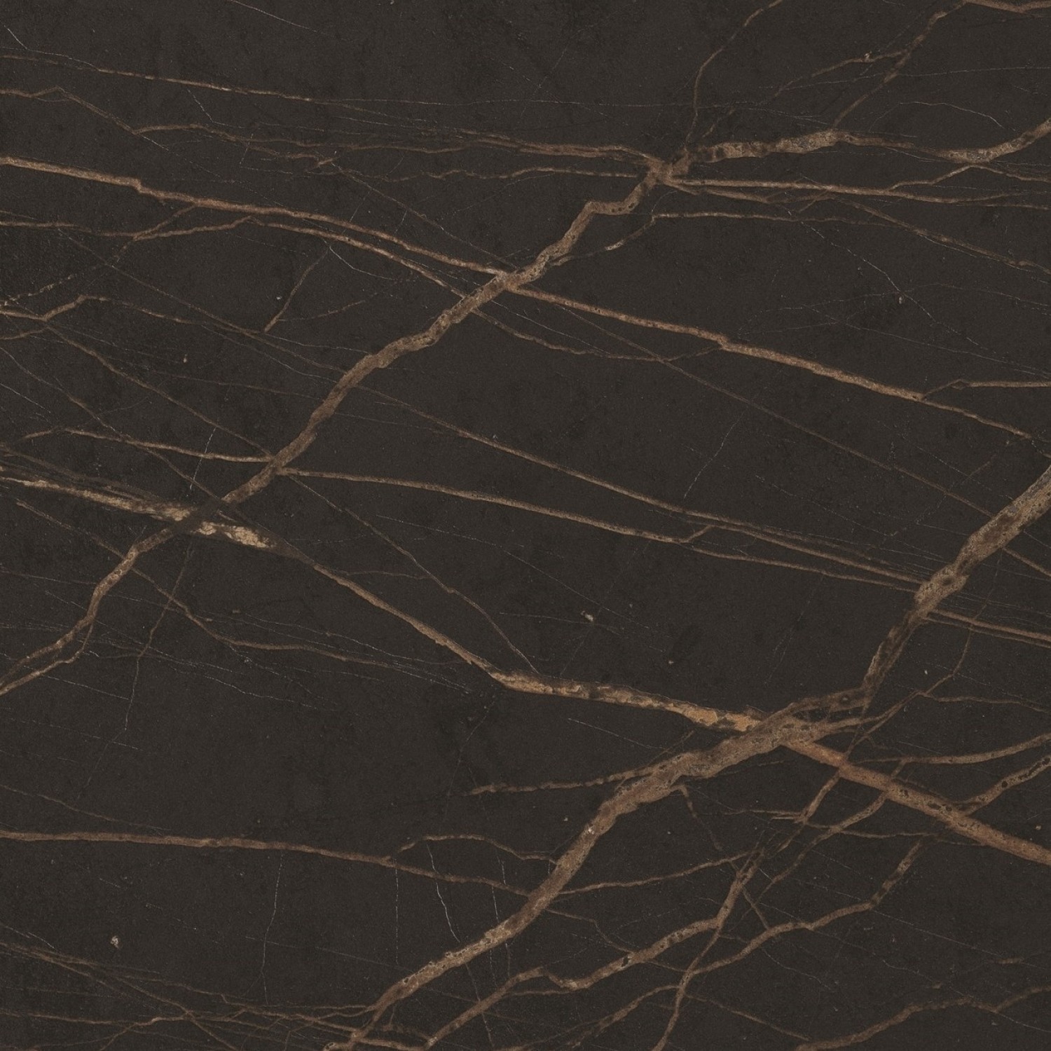Inspirado en la piedra natural Saint Laurent. Su textura superficial añade un juego de matices que potencian el contraste de sus tonos. Las vetas doradas jerarquizan el espacio y aportan calidez a un fondo frío de tonos oscuros que dan profundidad al conjunto.